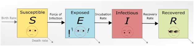 首先,要考慮一個島嶼,即我們的系統(tǒng),不允許人們進(jìn)出。每個人在給定時間都可以處于以下狀態(tài)之一:易感感染已康復(fù),因此縮寫為SIR,因為從未患過該?。?span>S)的人很有可能會生病并在一定時間內(nèi)感染(I),然后恢復(fù)(R)。就新型冠狀病毒而言,將模型擴展為附加狀態(tài)已暴露是適當(dāng)?shù)模园ň哂胁《镜形锤腥镜娜耍?span>SEIR模型)。