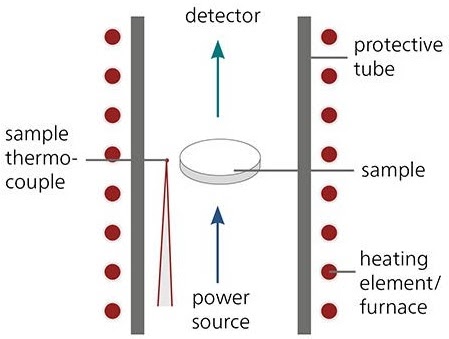 在上圖中,顯示了用于執(zhí)行LFA的設(shè)備的示例。圖中的示例代表了板材。該測(cè)試通常在封閉的機(jī)器中進(jìn)行,并通過軟件分析結(jié)果。關(guān)注的參數(shù)是熱擴(kuò)散率,可以使用以下公式確定: