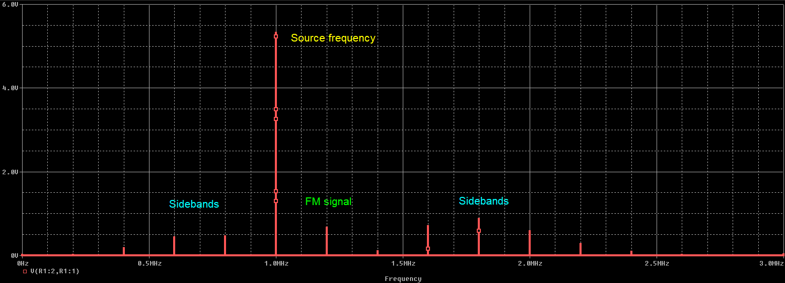 運行于1 MHz的電路的傅立葉頻譜,該電路接收1.2 MHz的FM EMI信號