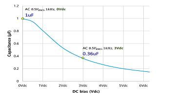 1.在此圖中,我們看到有效電容如何隨著施加的直流偏置電壓的增加而下降。