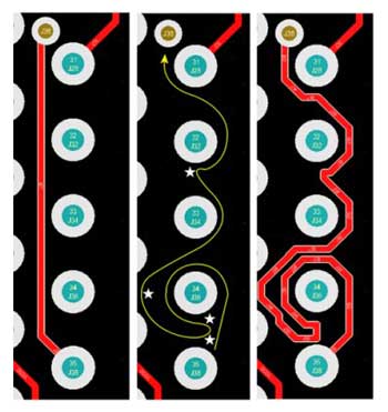 組件的放置和布線是PCB設(shè)計(jì)工具提供的原始功能,而這些功能對于當(dāng)今的設(shè)計(jì)師仍然至關(guān)重要。當(dāng)今先進(jìn)的設(shè)計(jì)工具通過交互式布線來沿光標(biāo)路徑放置布線部分,實(shí)現(xiàn)在障礙物上推動(dòng)或行走,并自動(dòng)跟隨現(xiàn)有連接,從而幫助較大化布線效率和靈活性。光標(biāo)引導(dǎo)的布線使圍繞障礙物的復(fù)雜手動(dòng)布線變得快速,輕松和直觀。用鼠標(biāo)創(chuàng)建路徑,交互式布線器會(huì)嘗試根據(jù)該路徑放置軌道。1顯示了如何在光標(biāo)移動(dòng)引導(dǎo)的情況下快速創(chuàng)建復(fù)雜的路線。左圖顯示了一條正常的最小長度的路線,中圖顯示了光標(biāo)路徑,星號(hào)表示單擊位置以提交路線的各個(gè)部分。正確的圖像是最終的布線。盡管是一個(gè)極端的示例,但它顯示了放置多個(gè)軌道所需的布線提交數(shù)量。